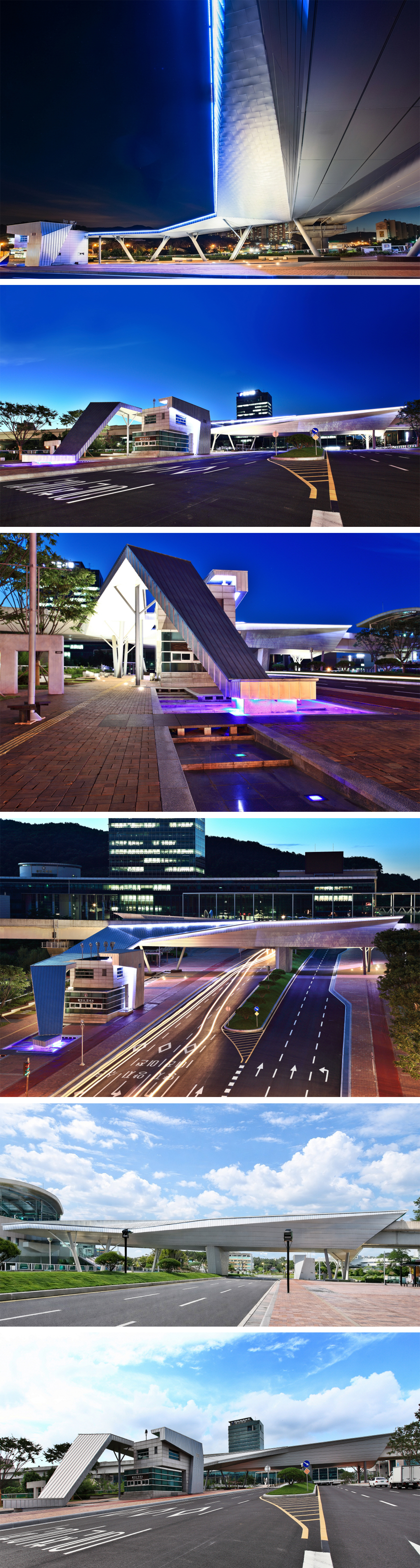 거시적 도시계획 관점에서의 개념으로는 녹지 개념의 연속성을 위해 형태 컨셉을 도출하고, 미시적 관점으로는 기존 안내소의 정체성(identity) 유지와 기존 페이빙과의 연속성을 고려하였다. 그리고 기능적 측면에서의 주 진출입 동선과 경전철 역사와의 동선 연결의 매개체로서의 개념을 정립하였으며, 외장재료는 메탈릭 단일소재로 강조하여, 주변과 차별화함으로써 조화를 꾀하는 역발상적 개념을 반영하였다.