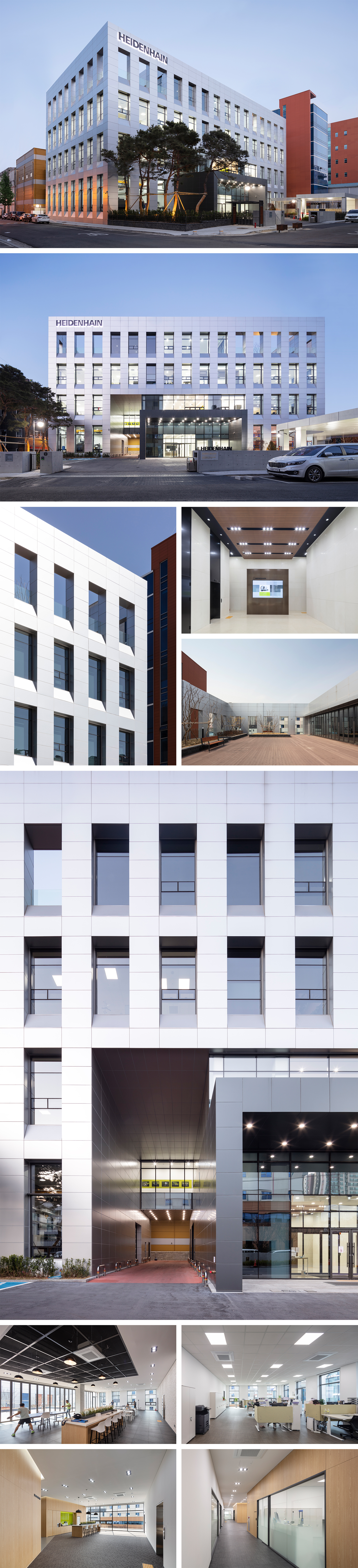 하이덴하인코리아 주식회사는 교통의 요지가 되는 안양시의 중심부로 안양시청이 있는 중심상업지역과 매우 근접하게 위치하고 있다. 전면 10미터 도로와 측면 9미터 도로 교차로 코너에 면하여 건물의 파사드에 대한 인지성이 매우 뛰어나며, 남서쪽으로 열린 부지 형상으로 인해 주변과 조화를 이루는 공간과 디자인을 계획하고자 하였다. 건물의 파사드는 내·외부 공간의 주장이 명확하다. 일명 전면의 빵빵이 창들은 정확하면서도 확실하게 내부의 공간을 외부에 투영하고 있다. 이는 '맞춤형 솔루션'이라는 슬로건으로 제품을 찾는 고객에게 정확한 솔루션을 제시하는 하이덴하인코리아의 신뢰를 기반으로 한 입면 파사드라 할 수 있다. 외장재로 쓰인 알루미늄 복합판넬의 정교함은 열림과 닫힘의 경계를 한층 더 돋보이게 하며, 창의 깊이감이 주는 볼륨은 자칫 밋밋해 보일 수 있는 디자인에 입체감을 불어넣었다. 전체 외관과 닮아있는 주출입구의 캐노피 역시 확실한 입구성을 나타낸다. 자칫 모호해질 수 있는 매스의 돌출부는, 재료로서 분절시켜주어 그 경계를 더욱 명확하게 하였다. 매스, 주출입구, 창의 비례는 적절한 위계 속에서 서로 조화를 이룬다. 주차램프 캐노피는 열린 진입 마당과 시야의 간섭이 생기지 않도록 곡선을 따랐으며, 자연스럽게 생성된 포켓 공간은 야외데크와 화단을 조성하여 사람들이 쉴 수 있는 쉼터로 계획하였다. 직원들의 휴게 공간으로 열려있는 지상 4층은 코어를 중심으로 양 옆에 옥상 정원을 조성하였다. 자유로운 동선을 지닌 열린 홀에서 바라보는 외부 공간은 조경, 데크와 한데 어우러져 트인 시야와 개방감을 느낄 수 있는 자연친화적 공간으로 탄생하였다. 다양한 액티비티가 내·외부로 자연스럽게 연계될 뿐만 아니라, 건물 외부의 경관들이 빵빵이 창의 프레임 속으로 스며들어와 또 다른 풍경을 연출한다.